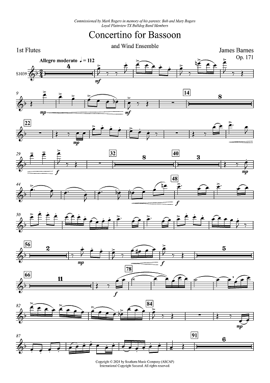 Digital Sheet Music for Concertino for Bassoon and Wind Ensemble - Flute 1 by James Barnes scored for Concert Band; id:504641