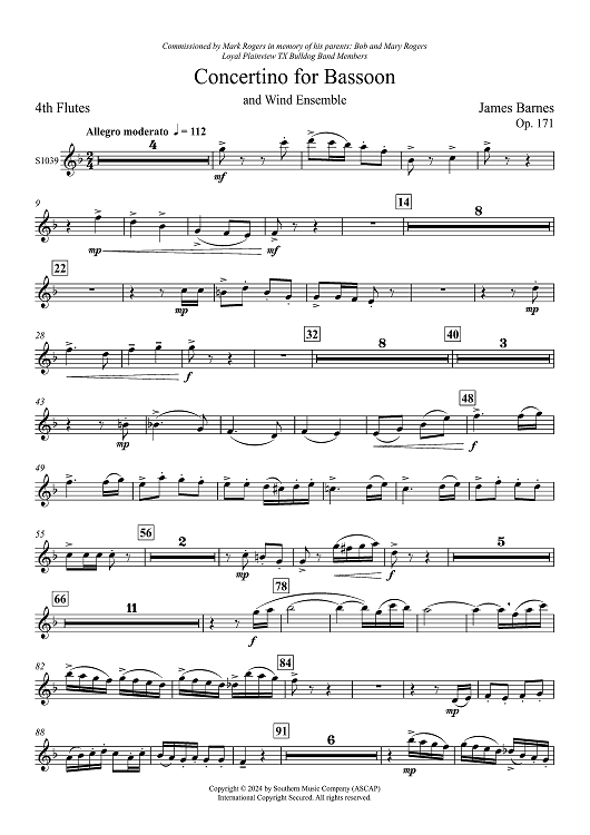 Digital Sheet Music for Concertino for Bassoon and Wind Ensemble - Flute 4 by James Barnes scored for Concert Band; id:504644