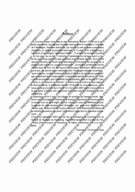 This piece, previously considered lost since its first performance, was described thus in reviews of that concert: "... The composition is modern and the humour appears to be that of the composer himself. Michel Nicolay, who has extraordinary technical skill and fabulous breathing control, leads this difficult work by the Munich composer Hartmann and is supported by the accompaniment of seven wind instruments. The bassoon provides rather a humorous bass line in the first section, with the whole work tending somewhat towards the burlesque. The second section contains some really astonishing passages."
