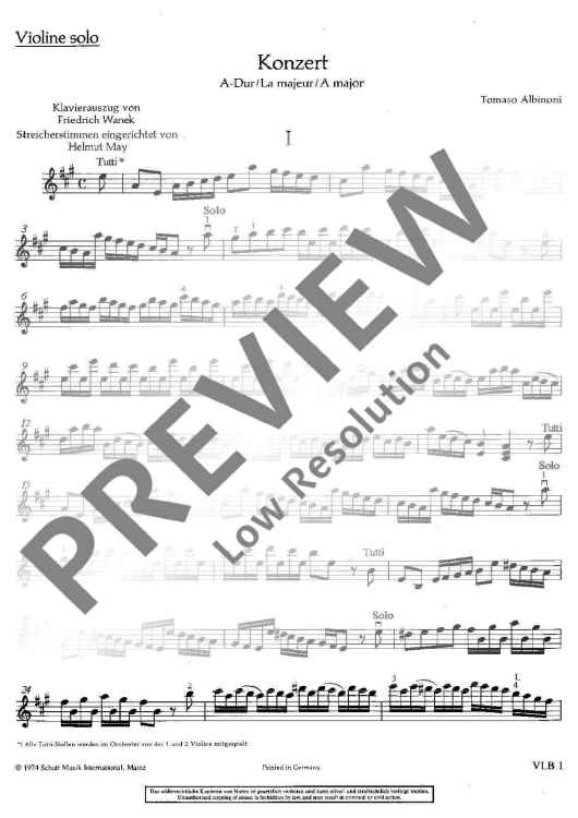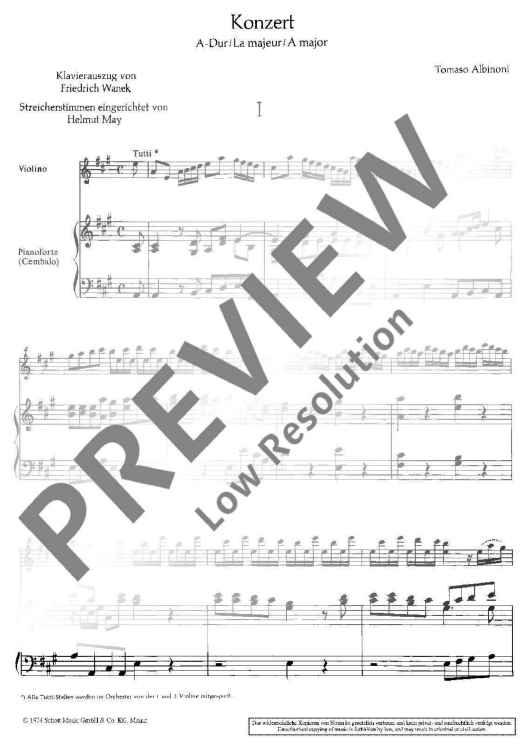 Digital Sheet Music for Concerto A Major - Piano Score and Solo Part by Tomaso Albinoni scored for Violin, String Orchestra And Basso Continuo; id:476571