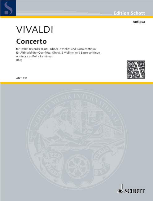 Digital Sheet Music for Concerto A minor - Score and Parts by Antonio Vivaldi scored for Treble Recorder (flute, Oboe), 2 Violins And Basso Continuo; Cello (viola Da Gamba) Ad Libitum; id:471165