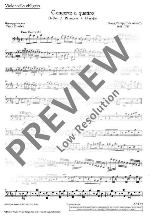 Digital Sheet Music for Concerto a quattro in D major - Basso by Georg Philipp Telemann scored for 2 Violins, Violoncello Obl. And Basso Continuo; id:480377