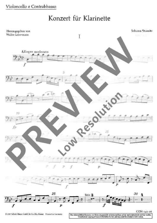 Digital Sheet Music for Concerto Bb Major - Violoncello/double Bass by Johann Wenzel Anton Stamitz scored for Clarinet And String Orchestra; 2 Horns Ad Libitum; id:491544