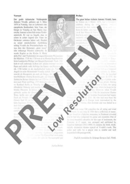 Vivaldi schrieb um die 500 Konzerte, sie umfassten alle Streich- und Blasinstrumente. Dass er auch für Gitarre und Mandoline komponiert hat, wurde erst im Jahr 1926 bei Auffindung einer Handschriftensammlung in einem Salesianerkloster im Piemont entdeckt. Eines der hübschesten Konzerte für diese Instrumentengattung, das C-Dur Konzert, hat Siegfried Behrend (1933-1990) bearbeitet und herausgegeben. Es enthält die frischen, rhythmisch prägnanten Themen, wie sie Vivaldi schrieb. Der Gitarre-Part setzt einen beweglichen Spieler voraus, der sich im Passagenspiel gut auskennt.