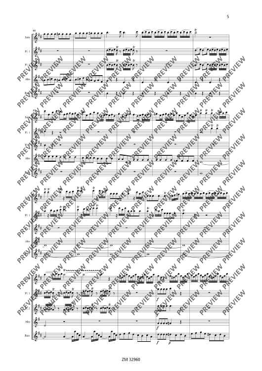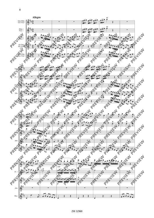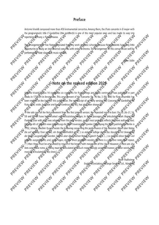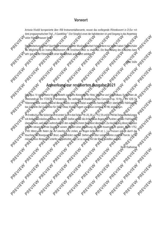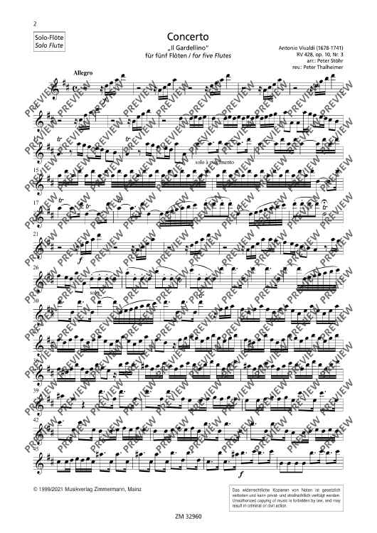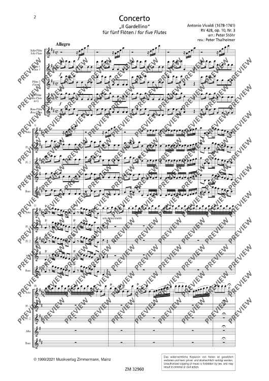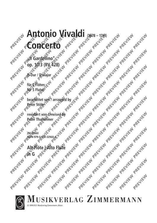 The Flute Concerto No. 3 from opus 10 by Antonio Vivaldi is certainly among his most popular works. 'Il Gardellino', 'The Goldfinch', is its programmatic title, and the solo flute does absolute justice to its content. The arrangement for 5 flutes makes this delightful work accessible for music school lessons as well. Professor Thalheimer has revised Peter Stöhr's arrangement on the basis of supplementary sources. The revised reprint is not compatible with previous editions due to optimized voice distribution. This work can also be performed by an ensemble.