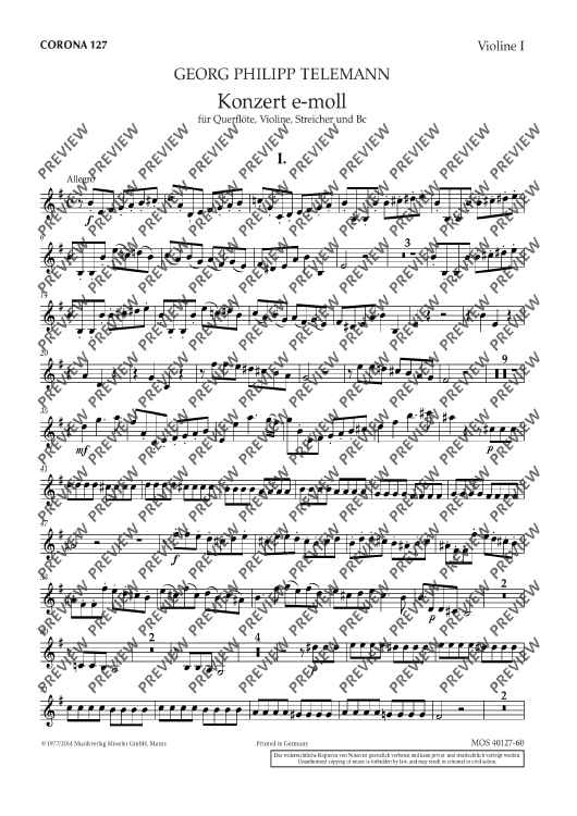 Digital Sheet Music for Concerto E Minor - Set of Parts by Georg Philipp Telemann, Adolf Hoffmann scored for Flute, Violin, String Orchestra And Basso Continuo; id:500233