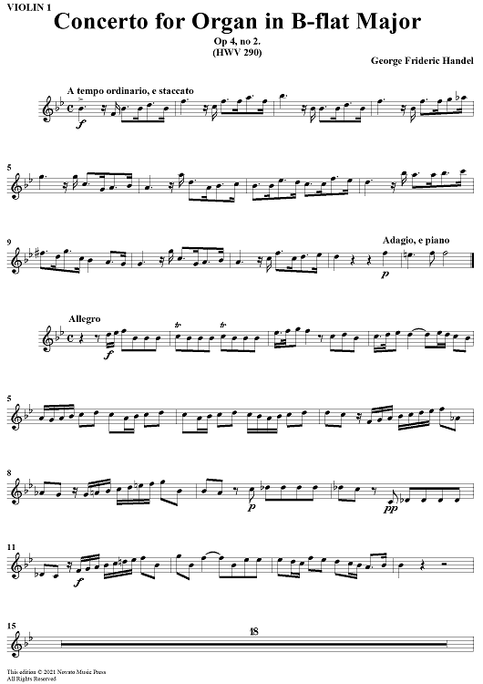 "Concerto for Organ in Bb Major, Op 4, No. 2 (HMV 290) - Violin 1" Sheet Music by George Frideric Handel