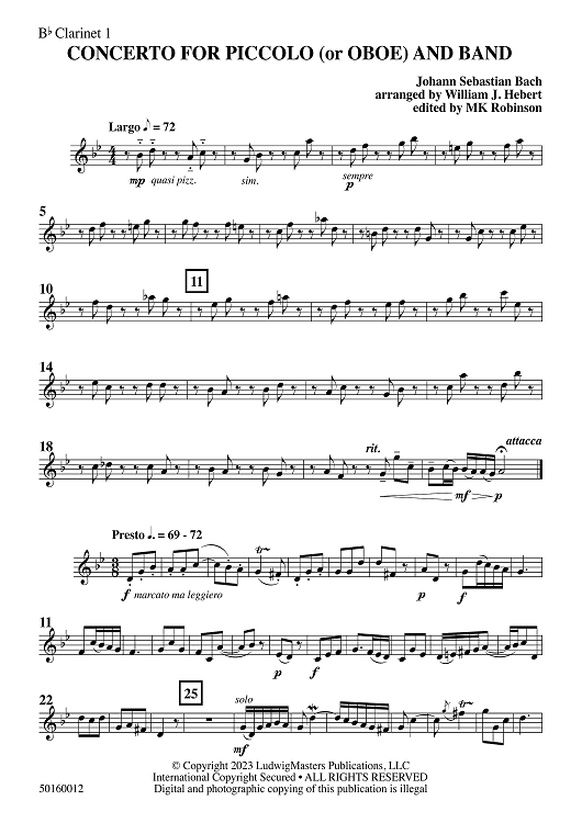 Digital Sheet Music for Concerto for Piccolo or Oboe and Band - Bb Clarinet 1 by Johann Sebastian Bach, William Hebert scored for Concert Band; id:510102
