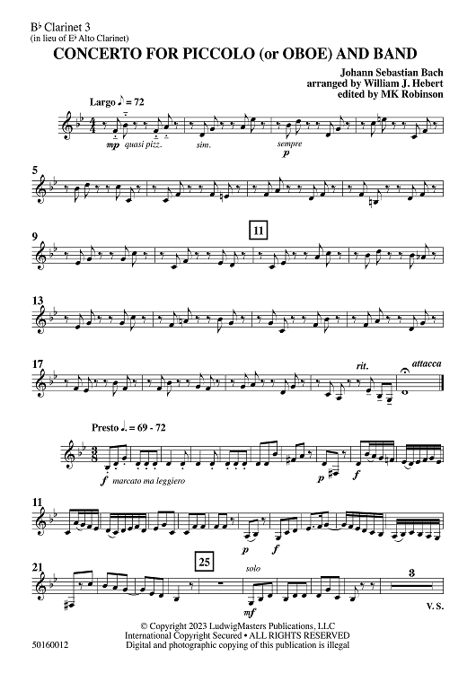 Digital Sheet Music for Concerto for Piccolo or Oboe and Band - Bb Clarinet 3 by Johann Sebastian Bach, William Hebert scored for Concert Band; id:510104