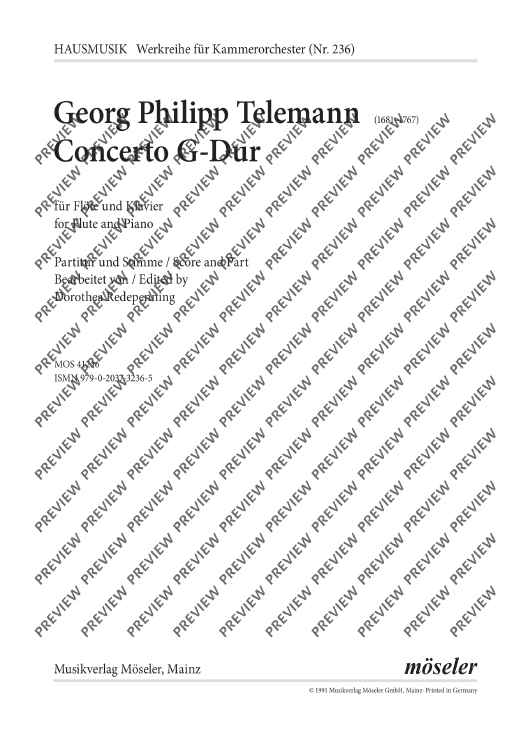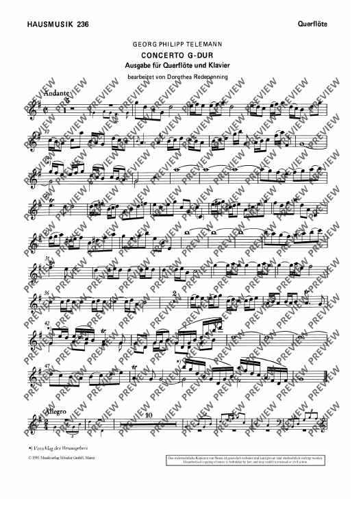 Digital Sheet Music for Concerto G Major - Piano Score and Solo Part by Georg Philipp Telemann, Dorothea Redepenning scored for Flute, String Orchestra And Basso Continuo; id:504801