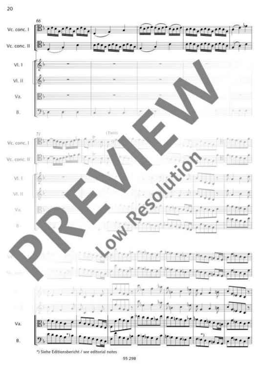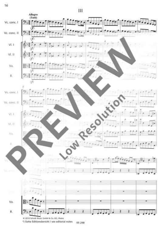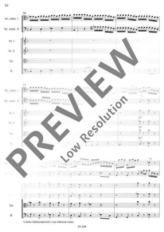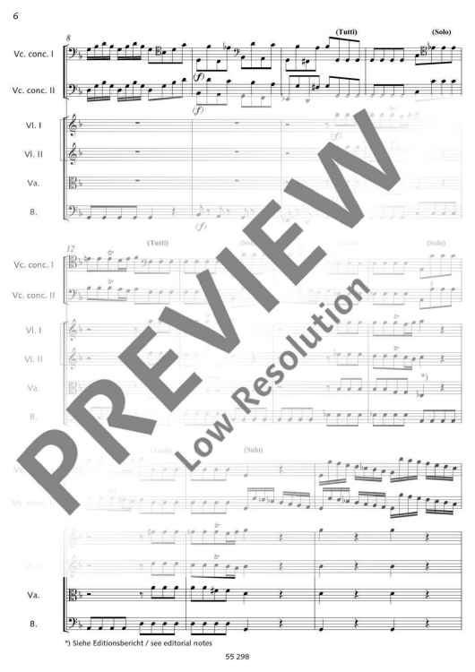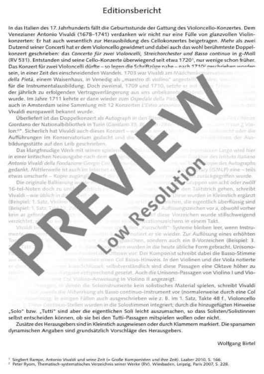 The genre of the violoncello concerto was born in 17th-century Italy. Thanks to the Venetian composer Antonio Vivaldi (1678–1741), there exists today not only a wealth of magnificent violin concertos but also quite a number of cello concertos to whose development he contributed considerably. More than two dozens of his concertos are dedicated to the violoncello, including the probably most famous double concerto: the 'Concerto for Two Violoncellos, String Orchestra and Basso continuo in G minor (RV 531)' written after 1770. The sonorous work with its playful outer movements and expressive largo is published in this critical new edition on the basis of the sources.