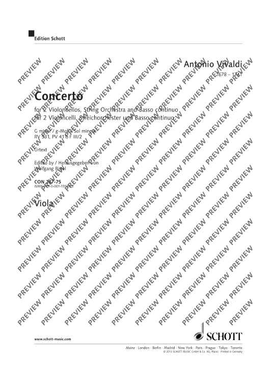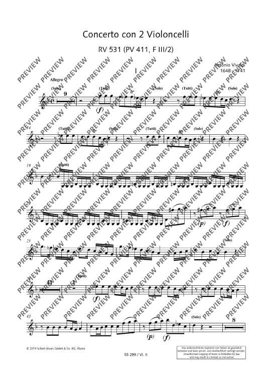 The genre of the violoncello concerto was born in 17th-century Italy. Thanks to the Venetian composer Antonio Vivaldi (1678–1741), there exists today not only a wealth of magnificent violin concertos but also quite a number of cello concertos to whose development he contributed considerably. More than two dozens of his concertos are dedicated to the violoncello, including the probably most famous double concerto: the Concerto for two violoncellos, string orchestra and basso continuo in G minor (RV 531) written after 1770. The sonorous work with its playful outer movements and expressive largo is published in this critical new edition on the basis of the sources.