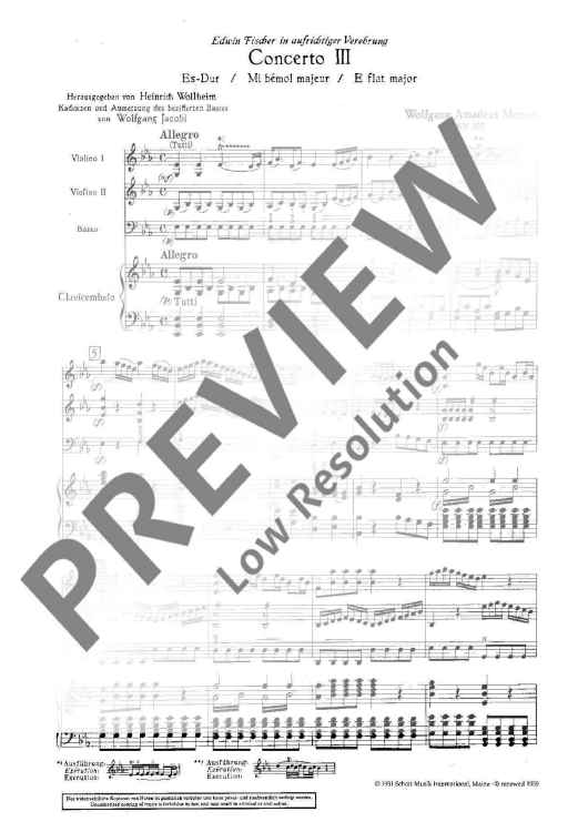 Digital Sheet Music for Concerto III Eb Major - Score and Parts by Wolfgang Amadeus Mozart, Heinrich Wollheim scored for Harpsichord (piano), 2 Violins And Bass (cello); id:471073