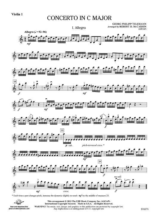 Digital Sheet Music for Concerto in C Major - Violin 1 by Georg Philipp Telemann, Robert D. McCashin scored for String Orchestra; id:431979