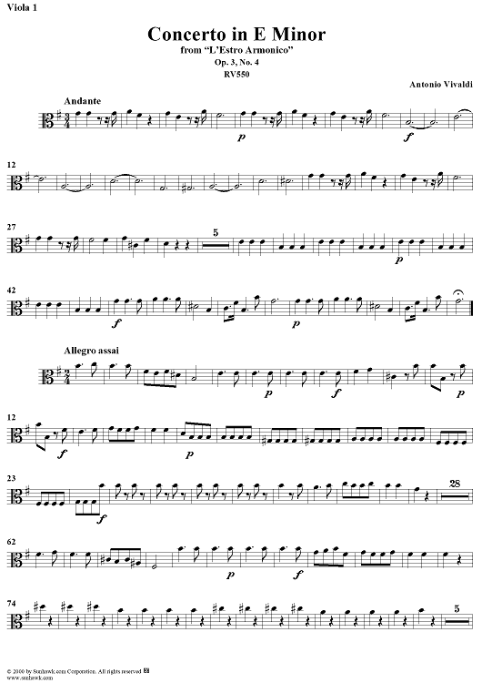 "Concerto in E Minor - from "L'Estro Armonico" - Op. 3/4 (RV550) - Viola 1" Sheet Music by Antonio Vivaldi