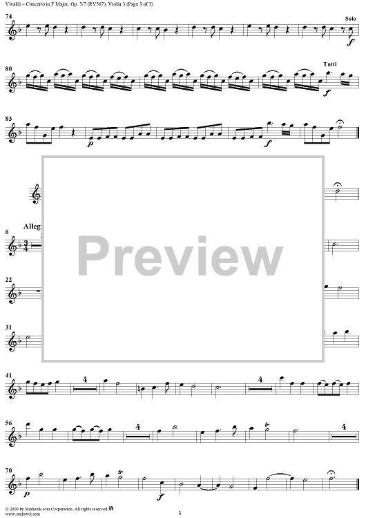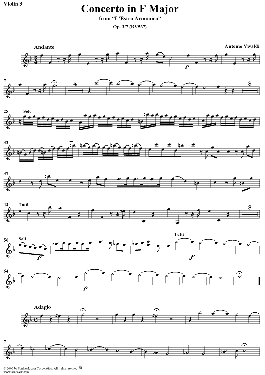 "Concerto in F Major - from "L'Estro Armonico" - Op. 3/7 (RV567) - Violin 3" Sheet Music by Antonio Vivaldi