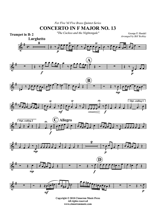Digital Sheet Music for Concerto in F Major No. 13 - "The Cuckoo and the Nightengale" - Trumpet 2 in Bb by George Frideric Handel, Bill Yeckley scored for Brass Quintet; id:427159