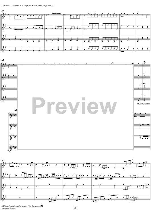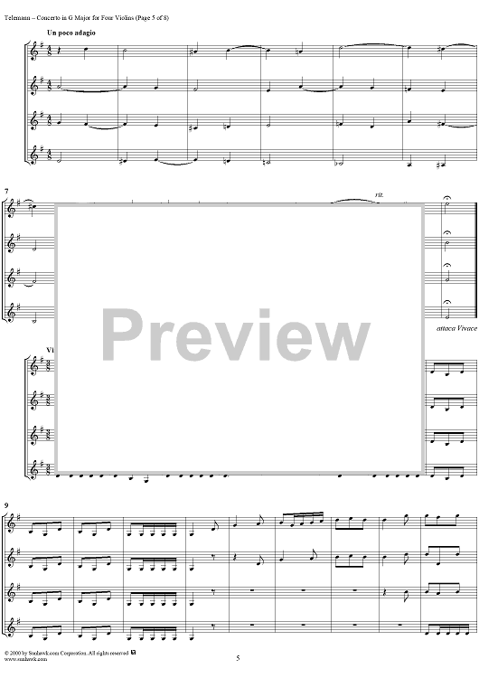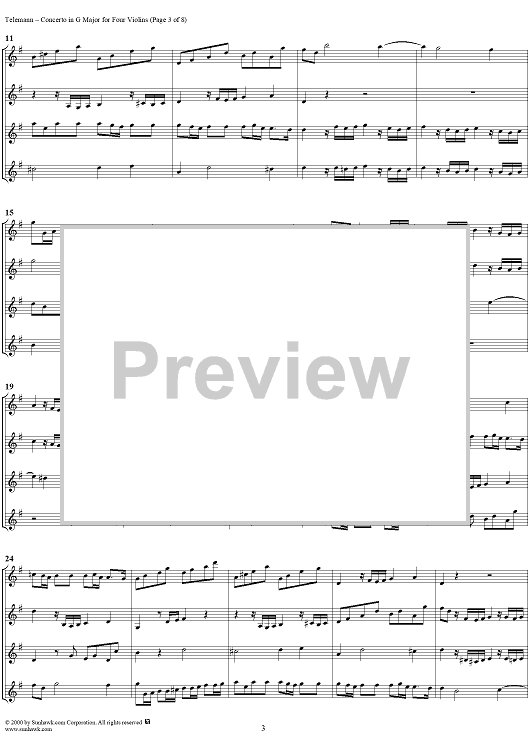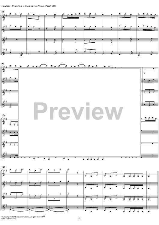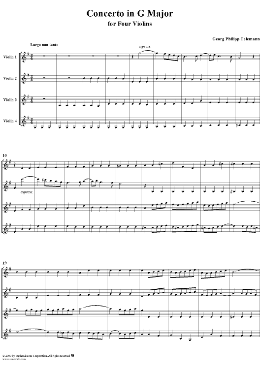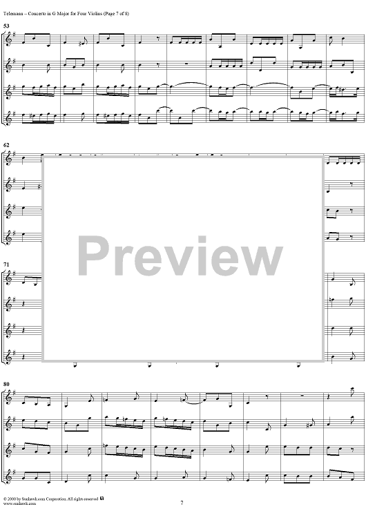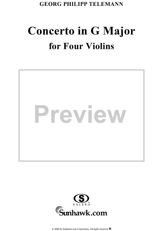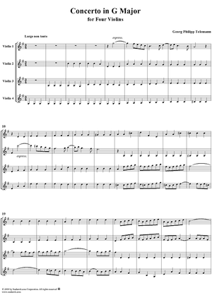 Digital Sheet Music for Concerto in G Major - Score by Georg Philipp Telemann scored for Violin Quartet; id:220580