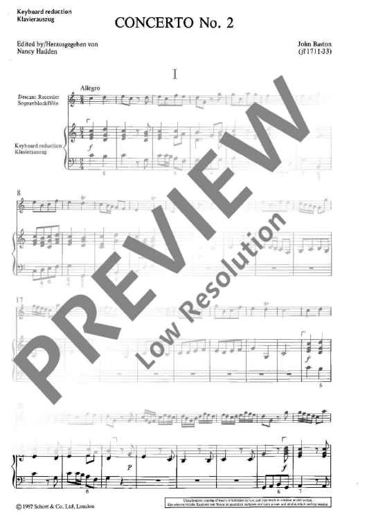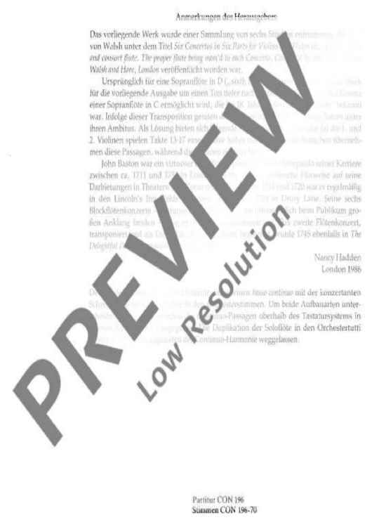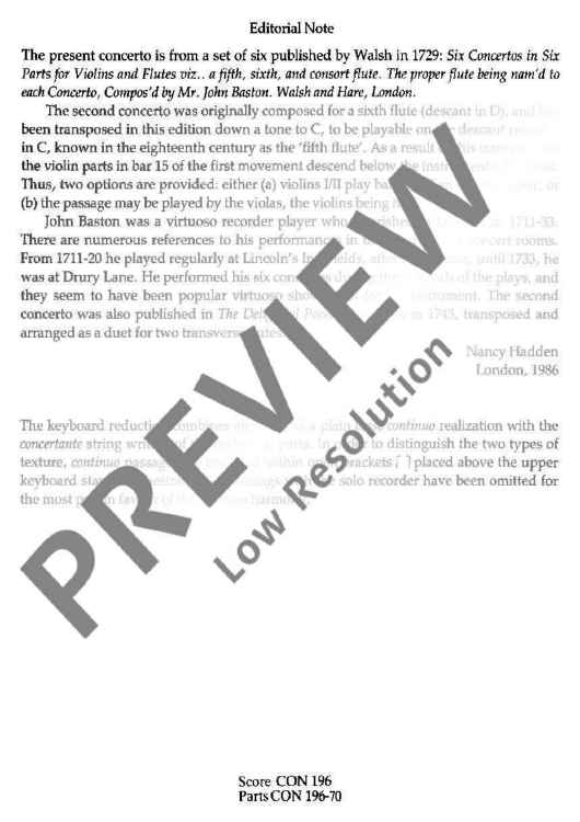 With these new editions, all six recorder concertos of John Baston are now available, each with score, piano score and parts. The thor-oughly edited scores follow essentially the first edition printed by John Walsh in London in 1729. Baston was regarded as an excellent recorder and flute player who worked with London opera orchestras in the early 18th century. His easy concertos anticipating the elegant melody of the early classical period enjoy great popularity representing a rewarding task for music school orchestras and advanced recorder players.