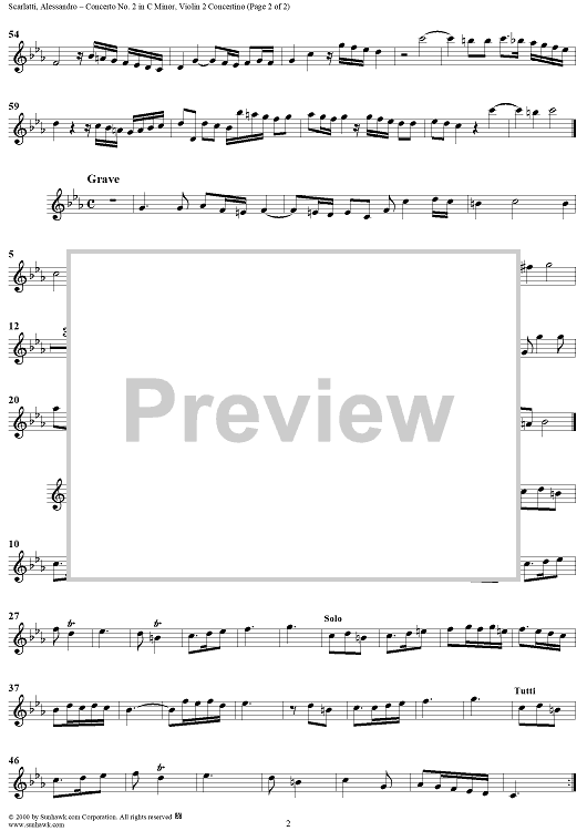 Digital Sheet Music for Concerto No. 2 in C Minor from "6 Concerti Grossi" - From "6 Concertos in 7 Parts" - Violin 2 Concertino by Alessandro Scarlatti scored for Strings/Continuo; id:257057