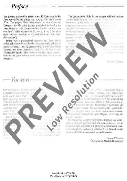 With these new editions, all six recorder concertos of John Baston are now available, each with score, piano score and parts. The thor-oughly edited scores follow essentially the first edition printed by John Walsh in London in 1729. Baston was regarded as an excellent recorder and flute player who worked with London opera orchestras in the early 18th century. His easy concertos anticipating the elegant melody of the early classical period enjoy great popularity representing a rewarding task for music school orchestras and advanced recorder players.