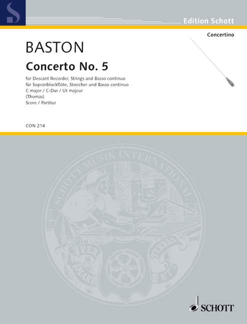 With these new editions, all six recorder concertos of John Baston are now available, each with score, piano score and parts. The thor-oughly edited scores follow essentially the first edition printed by John Walsh in London in 1729. Baston was regarded as an excellent recorder and flute player who worked with London opera orchestras in the early 18th century. His easy concertos anticipating the elegant melody of the early classical period enjoy great popularity representing a rewarding task for music school orchestras and advanced recorder players.