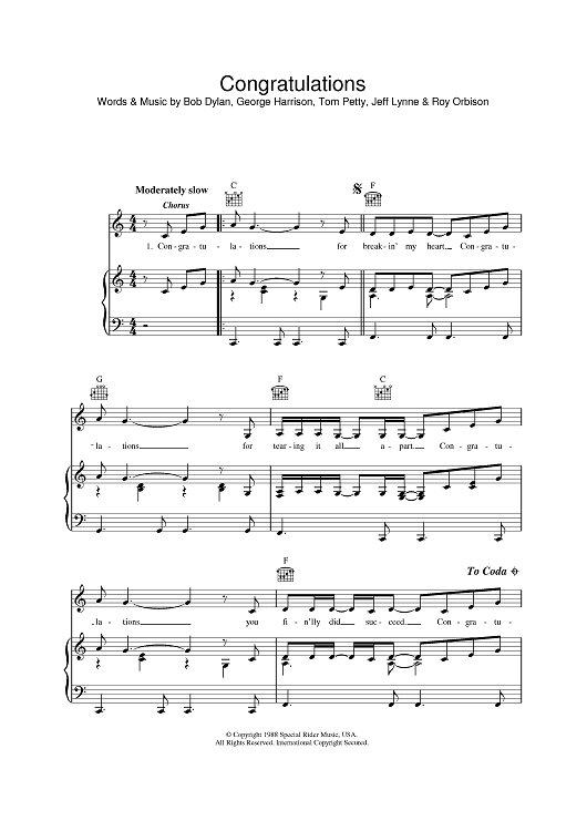 Digital Sheet Music for Congratulations by Roy Orbison, Bob Dylan, George Harrison, Tom Petty, Jeff Lynne scored for Piano/Vocal/Chords; id:389931