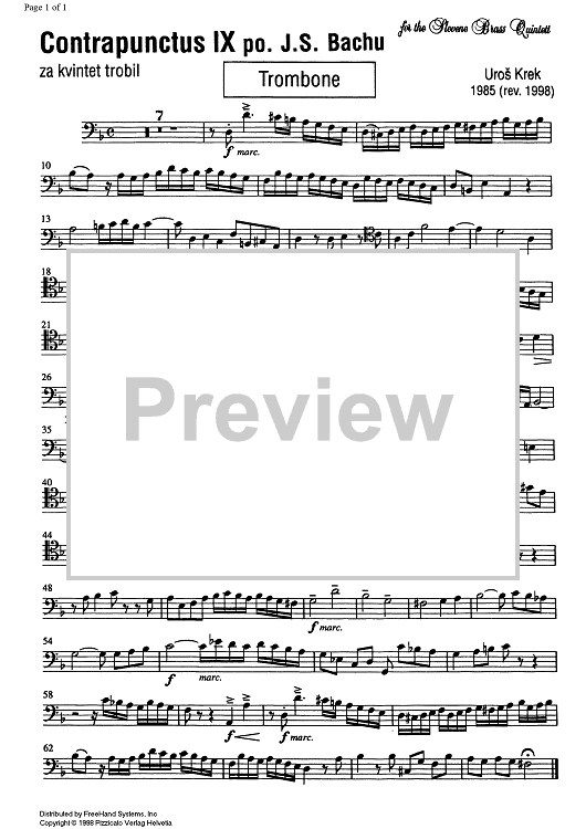 Digital Sheet Music for Contrapunktus IX - Trombone by , Uros Krek scored for Brass Quintet; id:335642