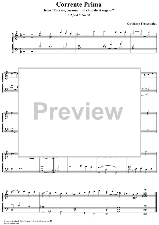 Digital Sheet Music for Corrente Prima, No. 33 from "Toccate, canzone ... di cimbalo et organo", Vol. II by Girolamo Frescobaldi scored for Harpsichord or Organ; id:295969