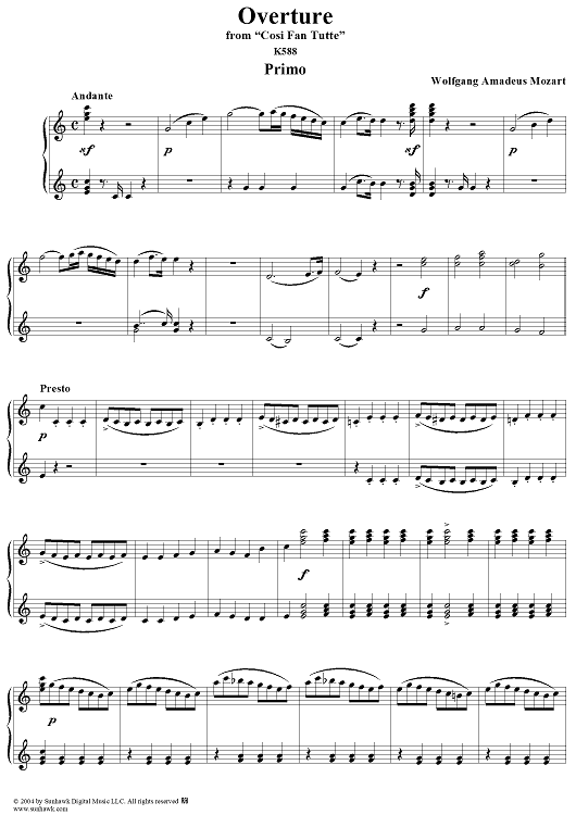 Digital Sheet Music for Cosi Fan Tutte, Overture, K588 by Wolfgang Amadeus Mozart scored for 1 Piano, 4 Hands; id:295556