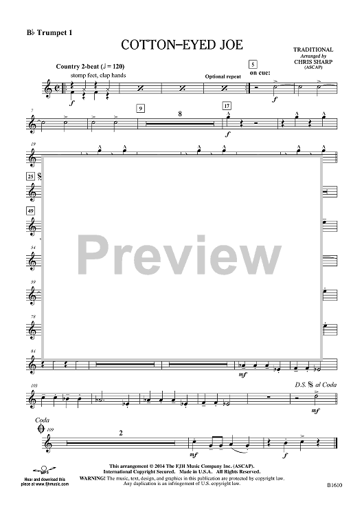 Digital Sheet Music for Cotton-Eyed Joe - Bb Trumpet 1 by Traditional, Chris Sharp scored for Concert Band; id:447841
