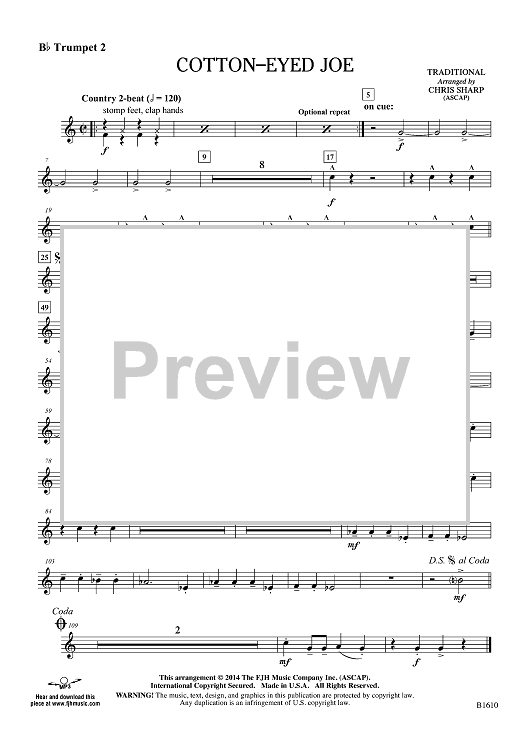 Digital Sheet Music for Cotton-Eyed Joe - Bb Trumpet 2 by Traditional, Chris Sharp scored for Concert Band; id:447842