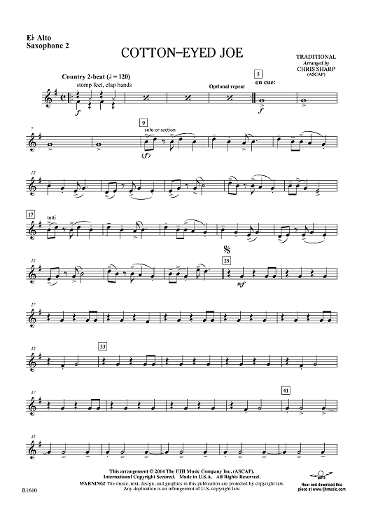 Digital Sheet Music for Cotton-Eyed Joe - Eb Alto Sax 2 by Traditional, Chris Sharp scored for Concert Band; id:447838