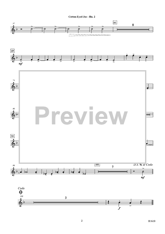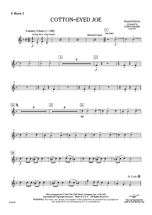 Digital Sheet Music for Cotton-Eyed Joe - F Horn 2 by Traditional, Chris Sharp scored for Concert Band; id:447845