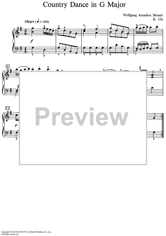 Digital Sheet Music for Country Dance in G Major [K. 15e] by Wolfgang Amadeus Mozart scored for Piano Solo; id:506909