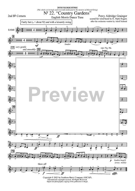 "Country Gardens for Symphonic Band - Bb Cornet 2" Sheet Music by Percy Grainger