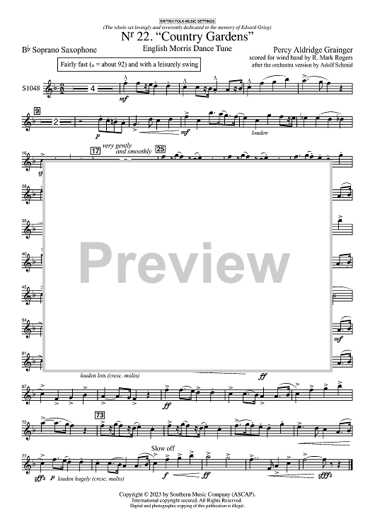 "Country Gardens for Symphonic Band - Bb Soprano Sax" Sheet Music by Percy Grainger