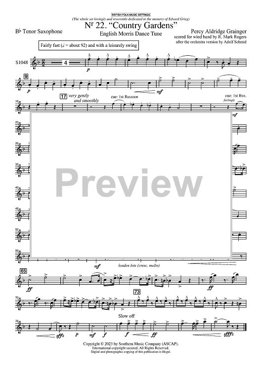 "Country Gardens for Symphonic Band - Bb Tenor Sax" Sheet Music by Percy Grainger