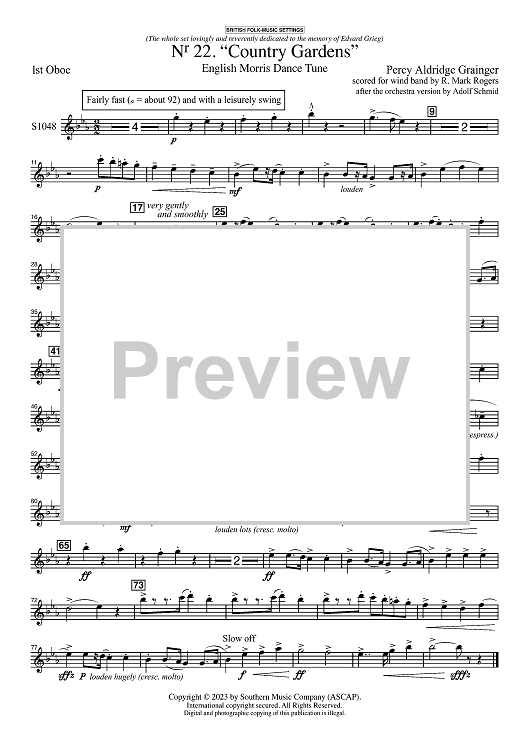 Digital Sheet Music for Country Gardens for Symphonic Band - Oboe 1 by Adolf Schmid, Percy Grainger, R. Mark Rogers scored for Concert Band; id:504367