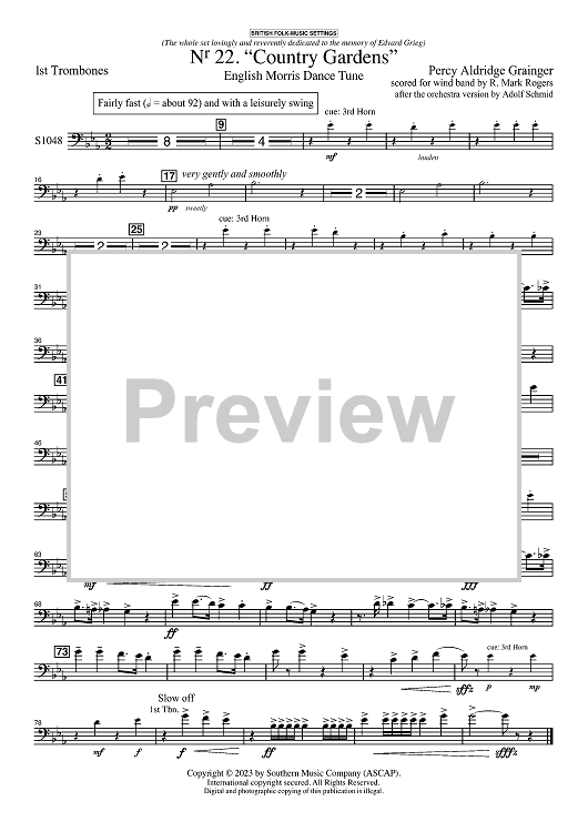Digital Sheet Music for Country Gardens for Symphonic Band - Trombone 1 by Adolf Schmid, Percy Grainger, R. Mark Rogers scored for Concert Band; id:504397