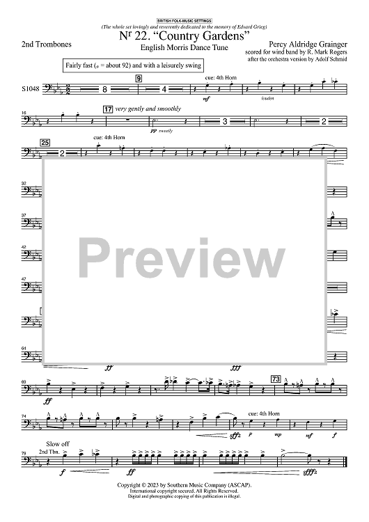 Digital Sheet Music for Country Gardens for Symphonic Band - Trombone 2 by Adolf Schmid, Percy Grainger, R. Mark Rogers scored for Concert Band; id:504398