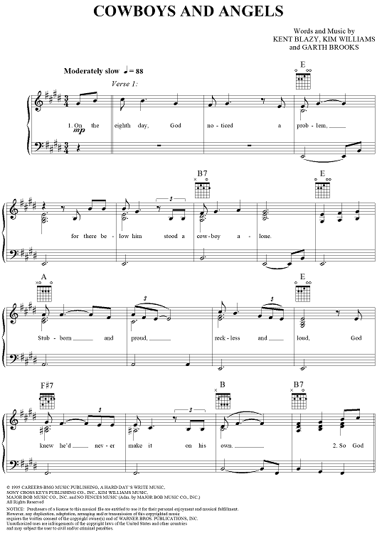 Digital Sheet Music for Cowboys and Angels by Garth Brooks, Kent Blazy, Kim Williams scored for Piano/Vocal/Chords; id:240668