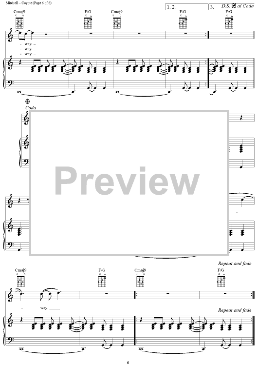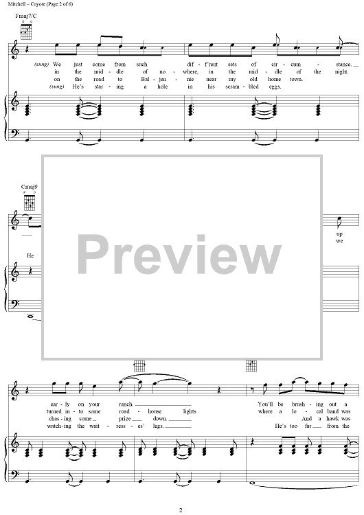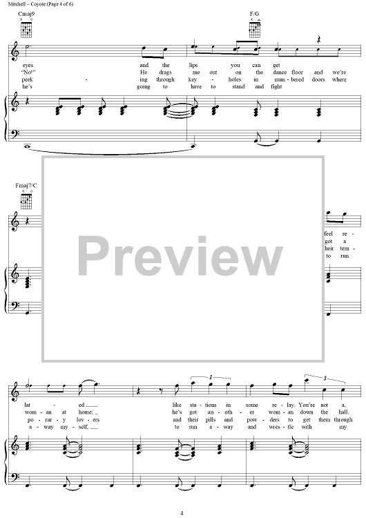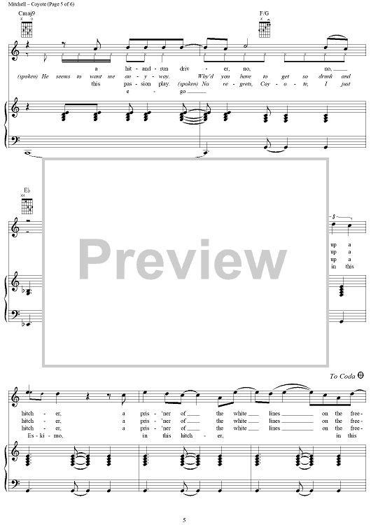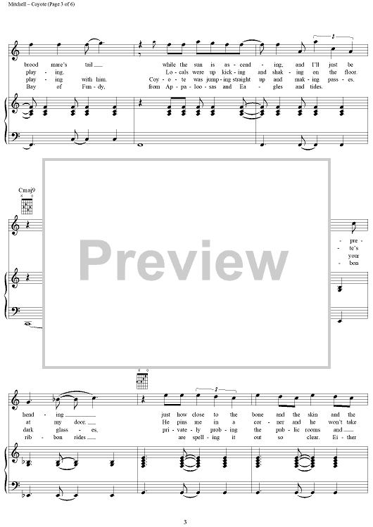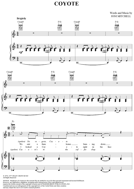 Digital Sheet Music for Coyote by Joni Mitchell scored for Piano/Vocal/Chords; id:251929