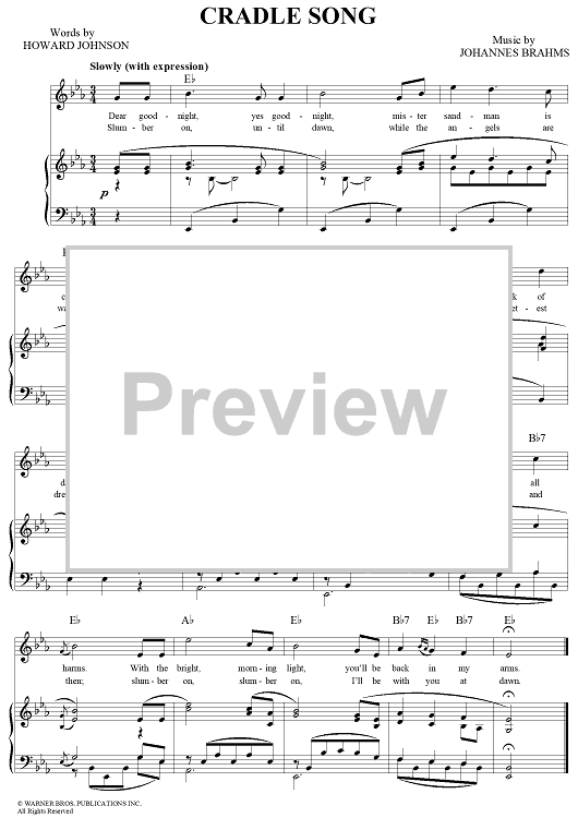 Digital Sheet Music for Cradle Song by Johannes Brahms, Howard Johnson scored for Piano/Vocal/Chords; id:116262