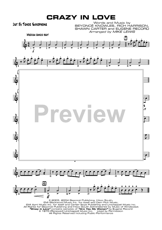 Digital Sheet Music for Crazy in Love - B-flat Tenor Saxophone 1 by Beyonce, Rich Harrison, Shawn Carter, Eugene Record, Mike Lewis scored for Jazz Ensemble; id:358691