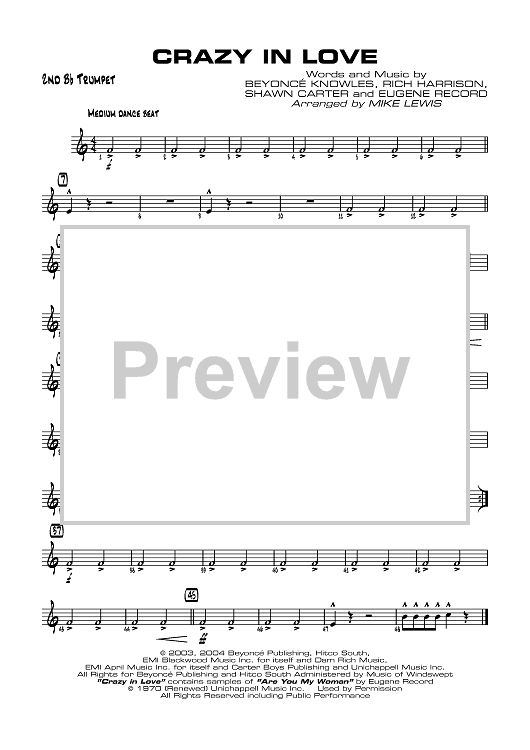 Digital Sheet Music for Crazy in Love - B-flat Trumpet 2 by Beyonce, Rich Harrison, Shawn Carter, Eugene Record, Mike Lewis scored for Jazz Ensemble; id:358695