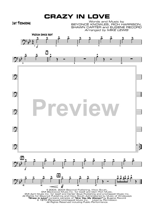 Digital Sheet Music for Crazy in Love - Trombone 1 by Beyonce, Rich Harrison, Shawn Carter, Eugene Record, Mike Lewis scored for Jazz Ensemble; id:358697