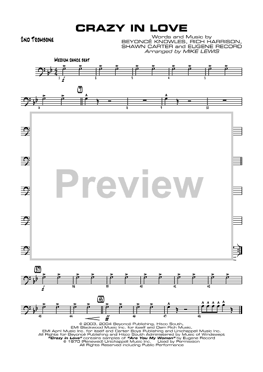 Digital Sheet Music for Crazy in Love - Trombone 2 by Beyonce, Rich Harrison, Shawn Carter, Eugene Record, Mike Lewis scored for Jazz Ensemble; id:358698
