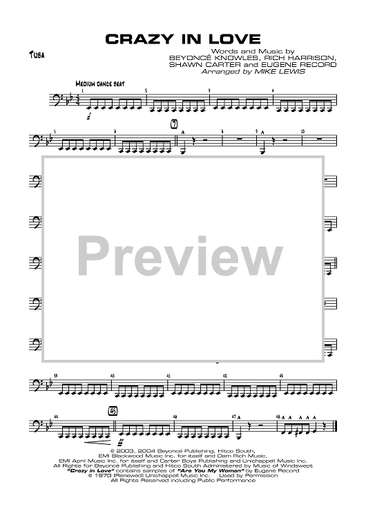 Digital Sheet Music for Crazy in Love - Tuba by Beyonce, Rich Harrison, Shawn Carter, Eugene Record, Mike Lewis scored for Jazz Ensemble; id:358702