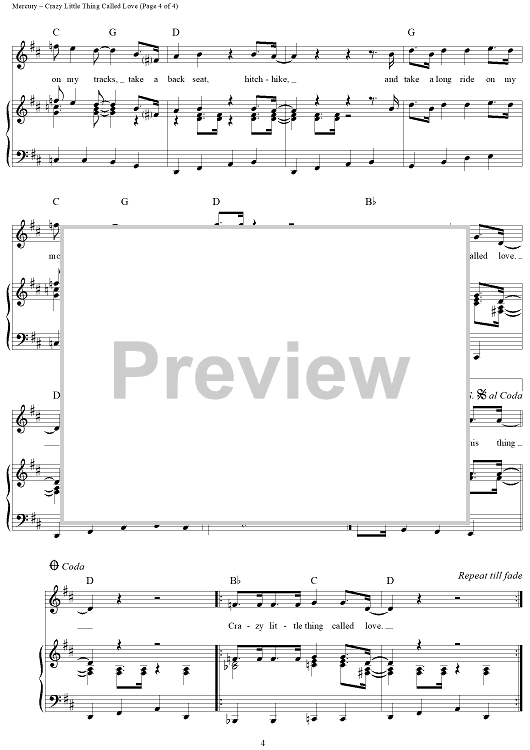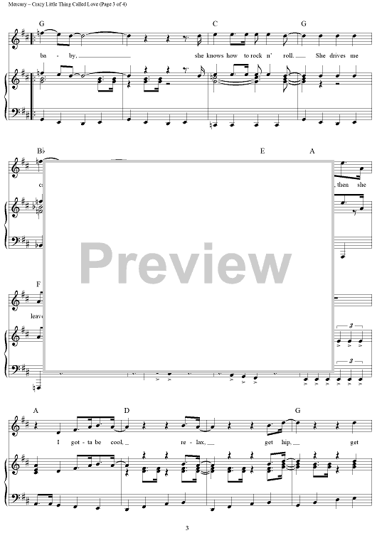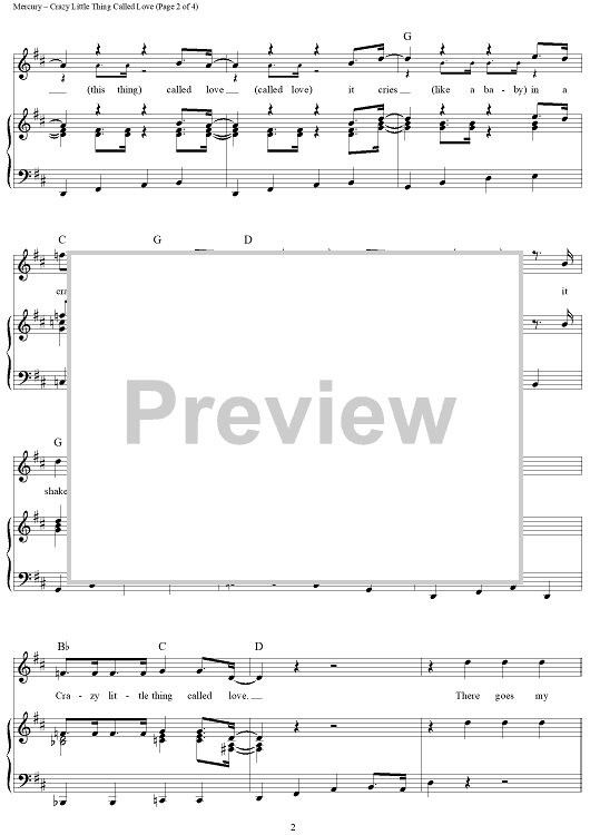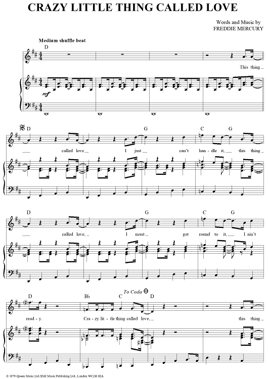 Digital Sheet Music for Crazy Little Thing Called Love by Queen, Freddie Mercury, Dwight Yoakam, Michael Buble scored for Piano/Vocal/Chords; id:362942